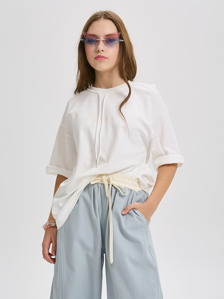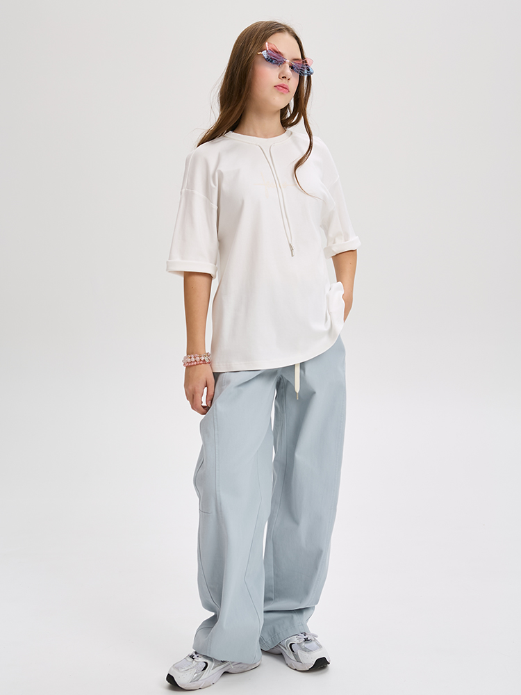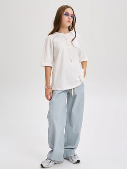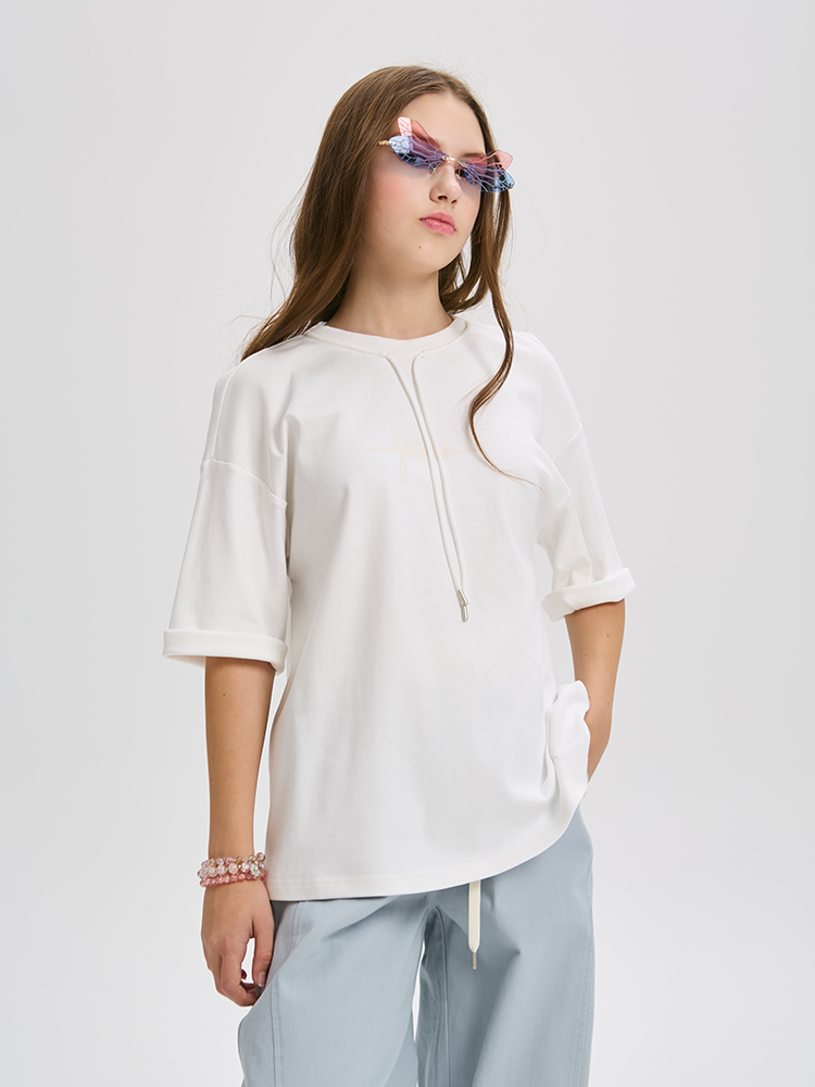 Футболка свободного кроя из мягкого трикотажа с декоративным элементом. Прямой, расширенный силуэт создает ощущение легкости и свободы.