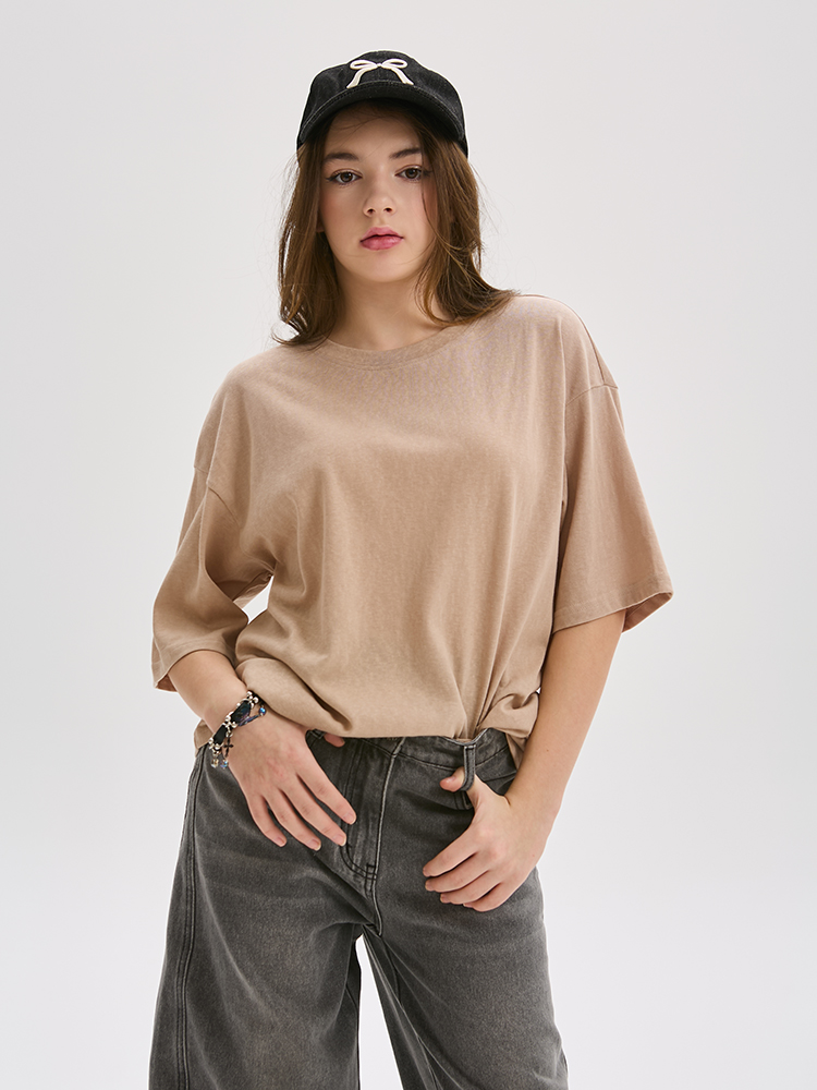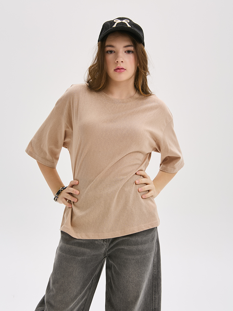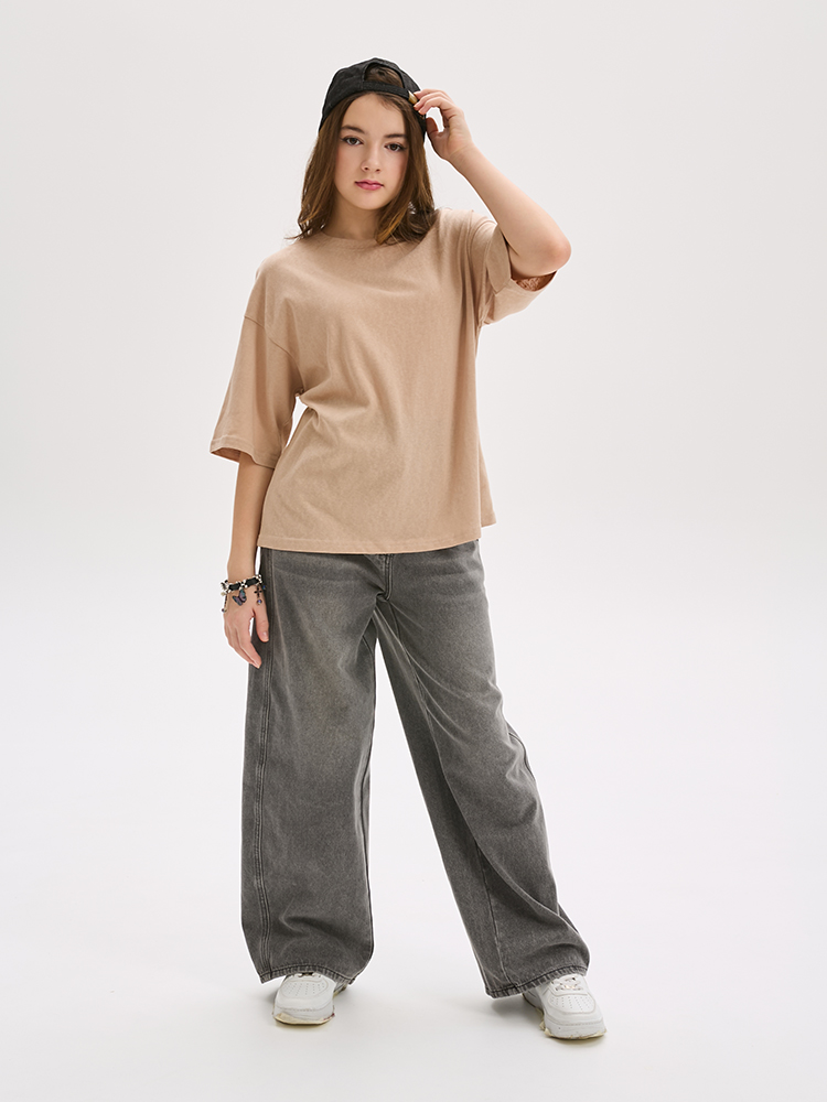 Однотонная, базовая футболка свободного кроя из мягкого трикотажа. Прямой, расширенный силуэт создает ощущение легкости и свободы.
