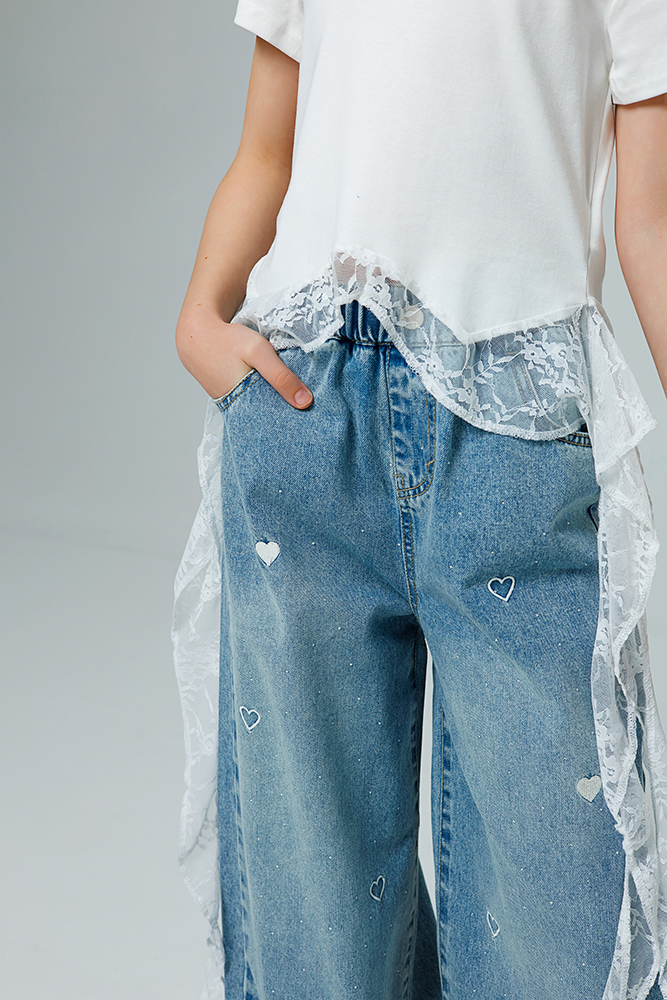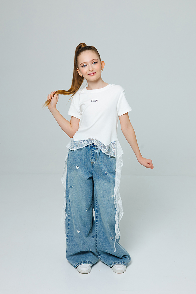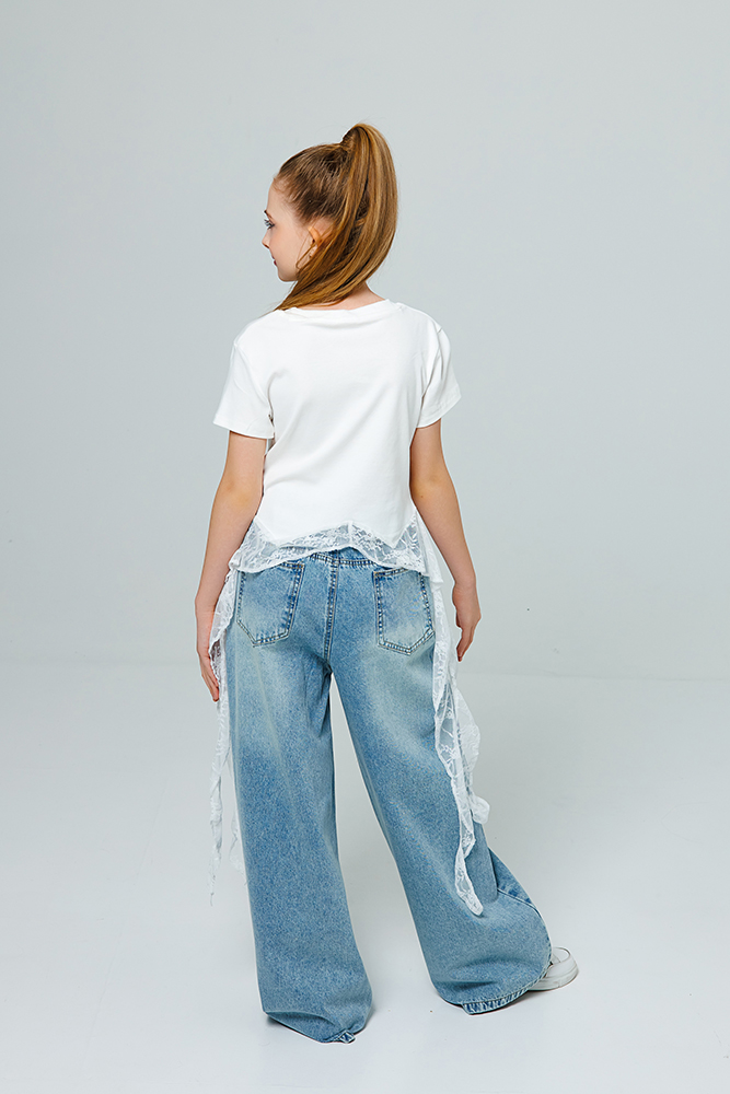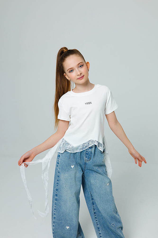 Футболка для девочки полуприталенного силуэта с гипюровым кантом по низу и удлиненными «хвостиками» по бокам. Такая модель сочетает в себе спортивный комфорт (благодаря крою), многослойность и романтичные детали. Изделие выполнено из мягкого трикотажа, 100% хлопок. Гипюр добавляет нотку нежности и нарядности, превращая простую футболку в изделие «с изюминкой».