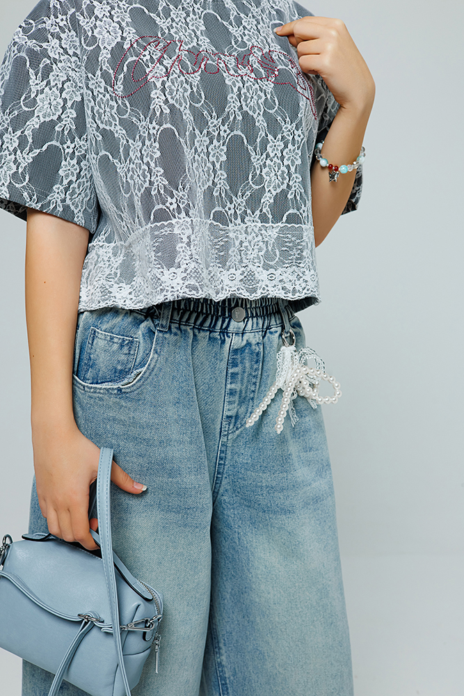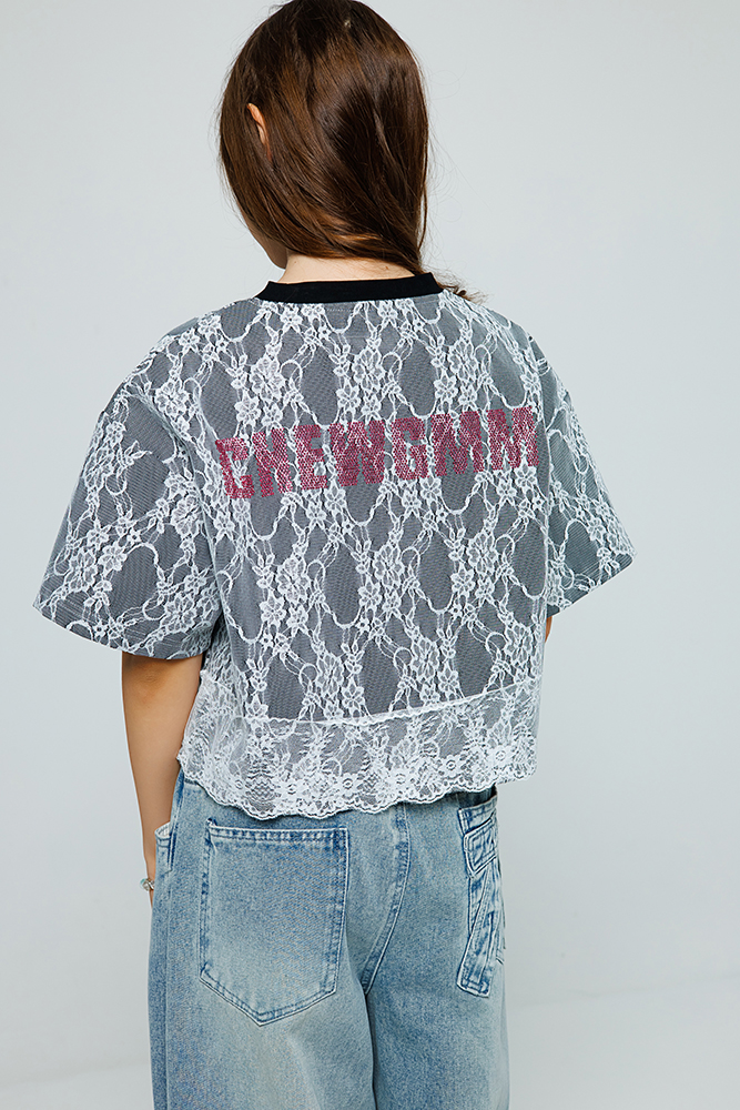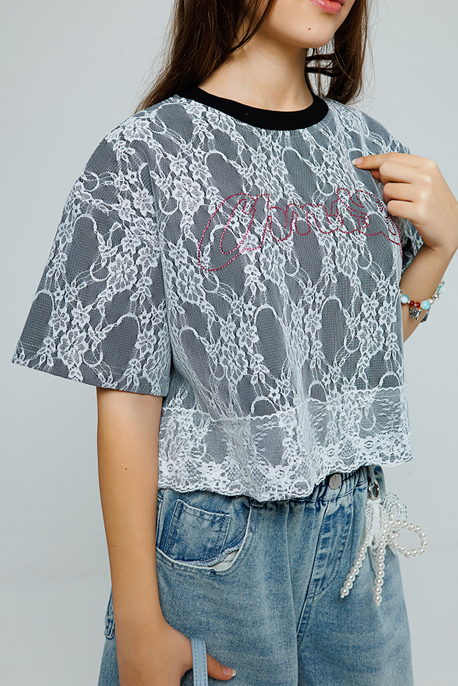 Стильная укороченная футболка свободного кроя для девочки, выполненная из качественного трикотажа. Мягкая основа комфортно сидит, не сковывая движений, а верхний слой из нежного гипюра придает модели особый шарм. Яркий акцент — текстовый принт, искусно выложенный стразами, который делает образ праздничным и запоминающимся.