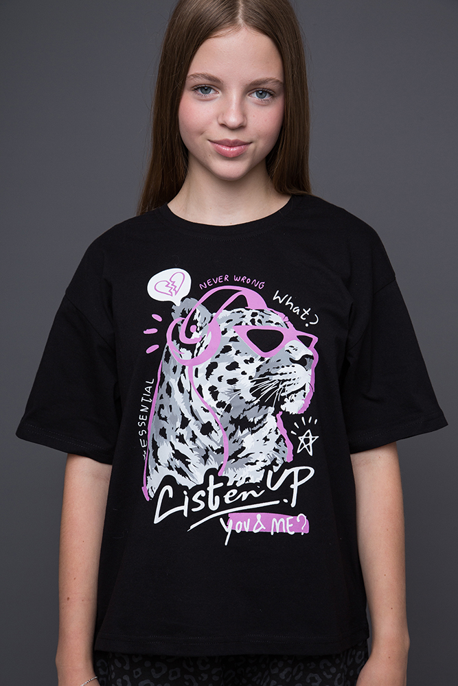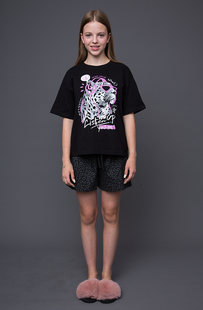 Пижамный комплект для девочки состоит из футболки с коротким рукавом и шорт в черном цвете. Мягкая дышащая ткань обеспечивает комфорт в любое время года. Идеальный вариант для повседневной носки.