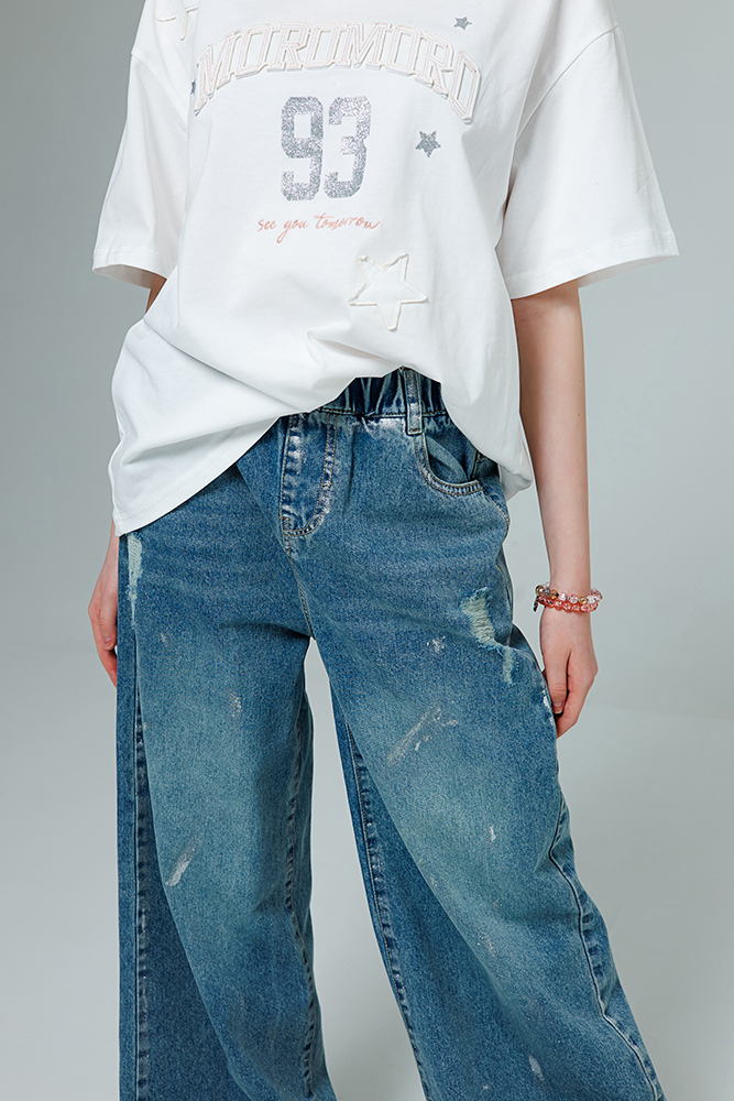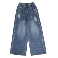 Джинсы палаццо насыщенного голубого цвета. Свободный крой, из денима средней плотности, на удобной резинке. Модель украшена рваными прорезями, легким серебристым напылением и эффектными мазками. Идеальный баланс комфорта и трендового дизайна.