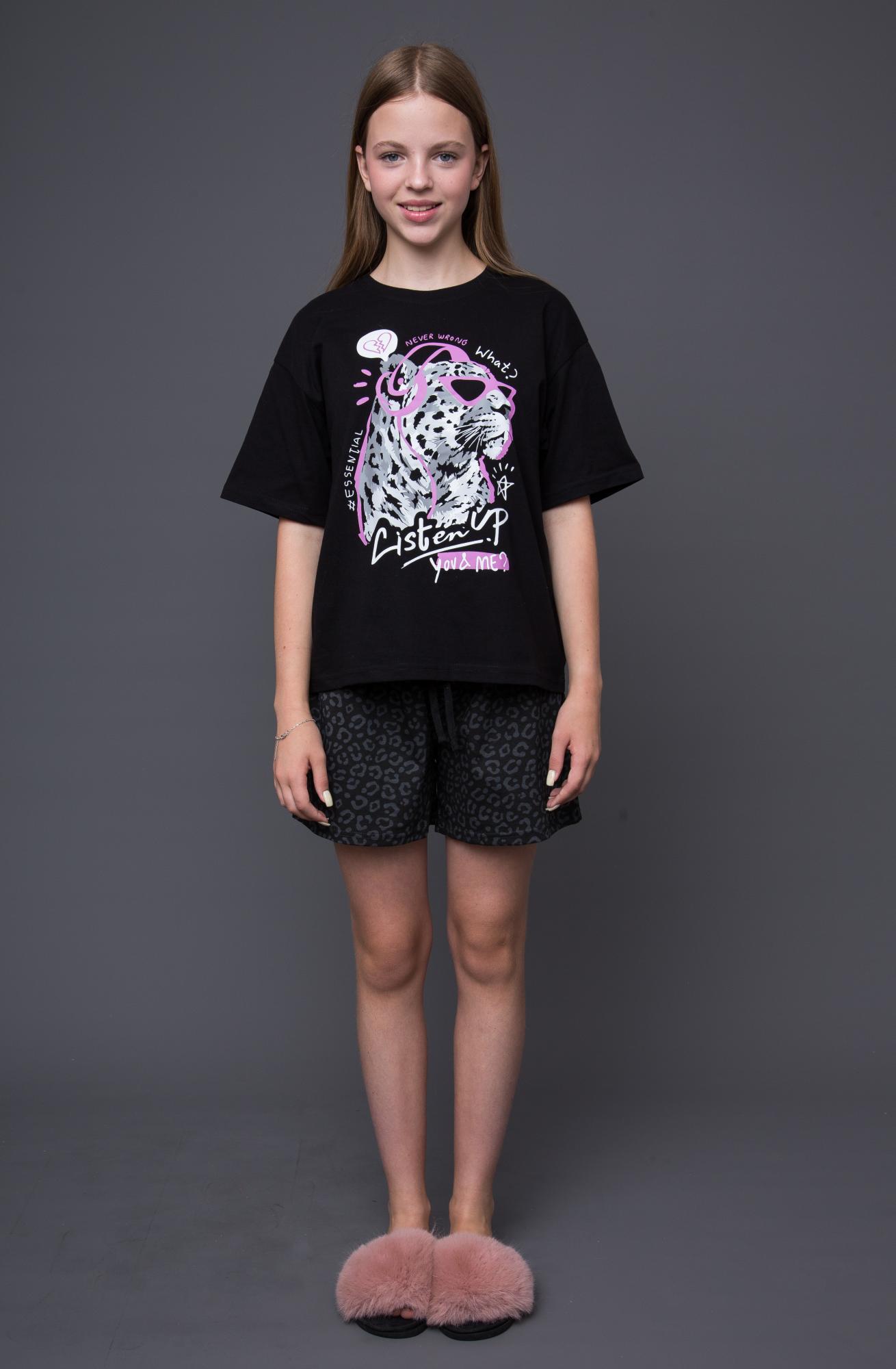 Пижамный комплект для девочки состоит из футболки с коротким рукавом и шорт в черном цвете. Мягкая дышащая ткань обеспечивает комфорт в любое время года. Идеальный вариант для повседневной носки.